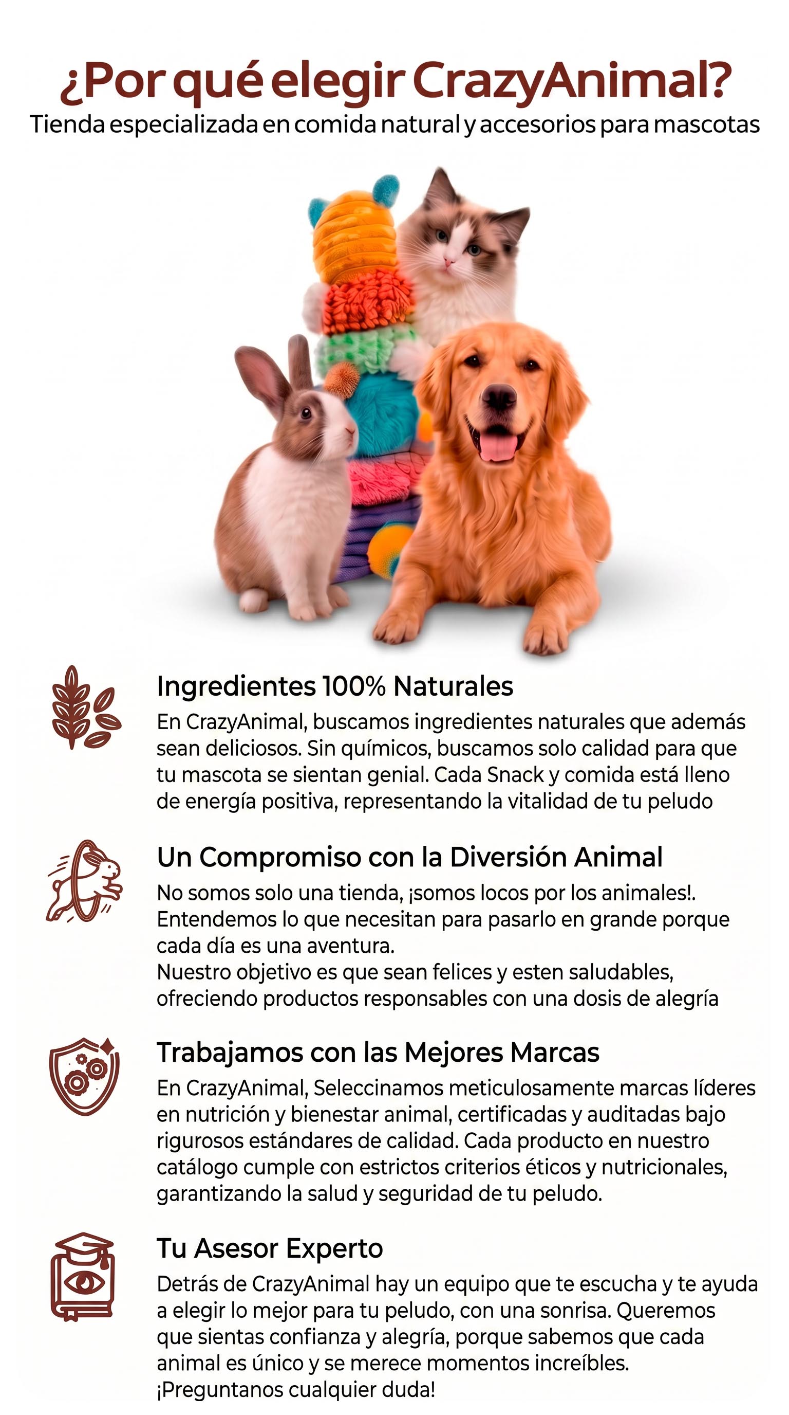 Únete a la familia de CrazyAnimal y descubre la diferencia de cuidar a tu mascota con productos libres de aditivos y llenos de amor.