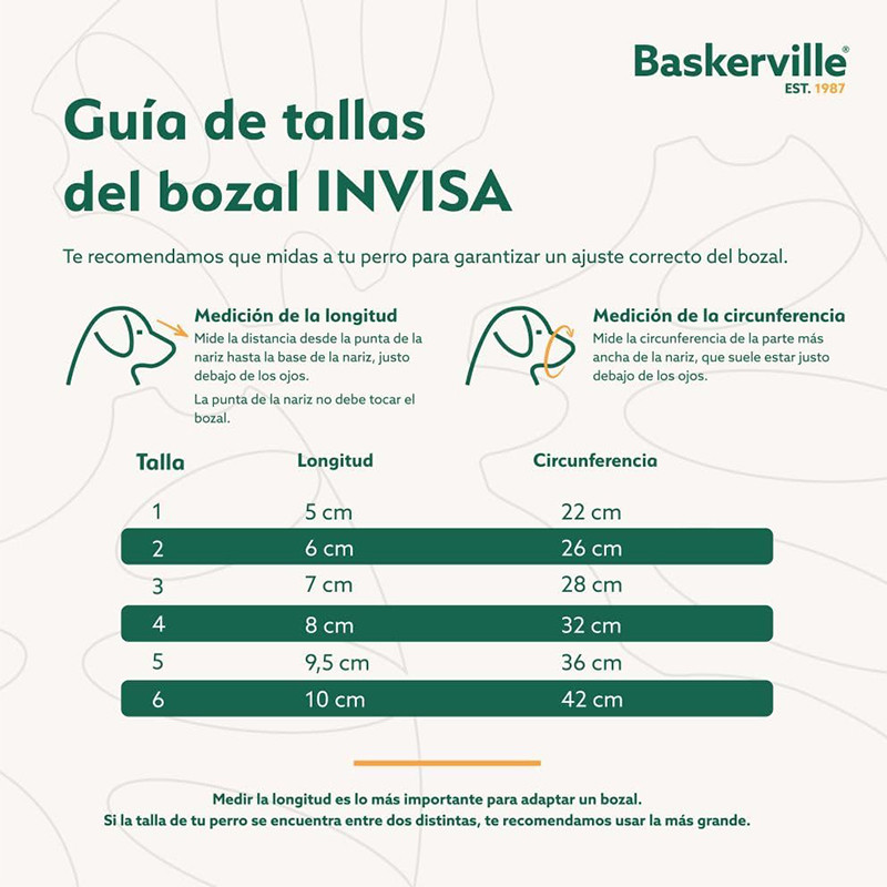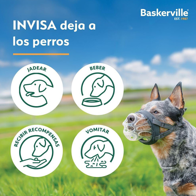 El Baskerville Bozal Invisa, bozal canino de alta calidad, permite que tu perro jadee y beba cómodamente. Su diseño transparente es discreto, seguro y cómodo. Ideal para adiestramiento, paseos y visitas al veterinario.
