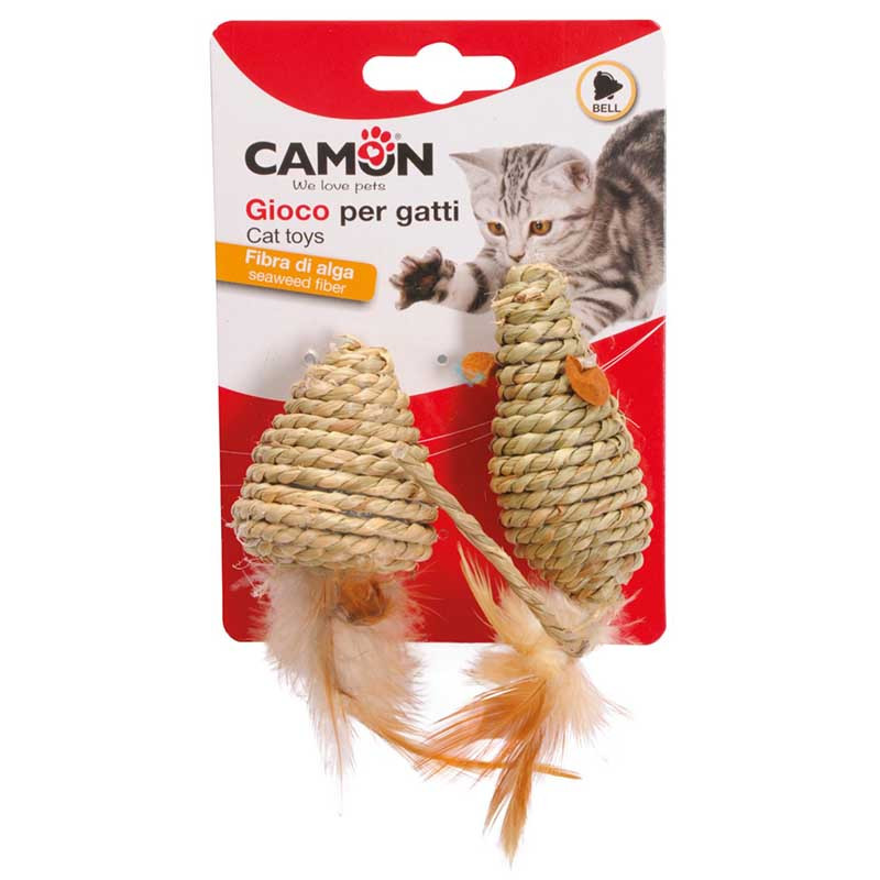 El ratón de cuerda Camon con plumas y sonajero es un juguete natural para gatos que estimula el instinto de caza gracias a su textura, movimiento y sonido. Fabricado con fibra de alga, es ligero, resistente y perfecto para el juego diario en gatos de todas las edades.