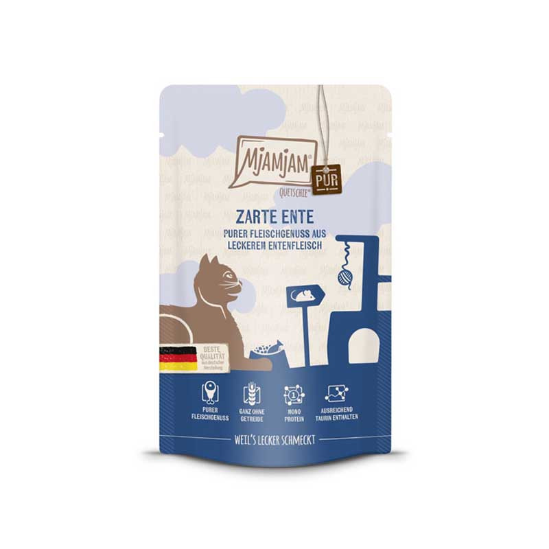 MjAMjAM Pura Carne de Pato Tierno es un alimento húmedo monoproteico, elaborado exclusivamente con carne de pato fresca de alta calidad. Su receta simple y natural está diseñada para gatos que necesitan una dieta con ingredientes limitados, fácil de digerir y sin cereales.