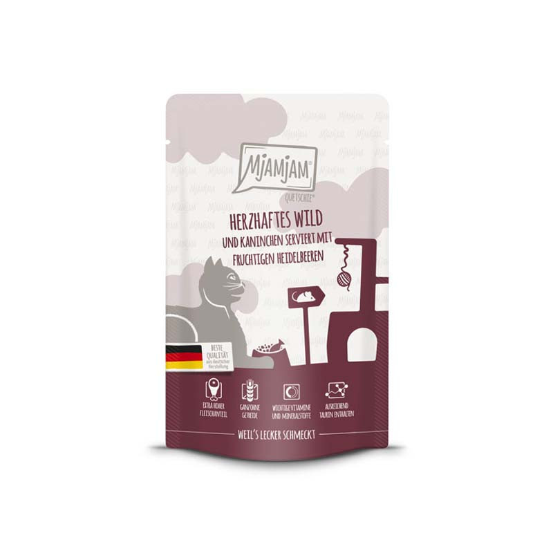 MjAMjAM Venado con Conejo y Arándanos es una comida húmeda natural para gatos elaborada con carnes de caza y fruta fresca. Receta premium sin cereales, muy digestible y perfecta para gatos exigentes o con alergias alimentarias.
