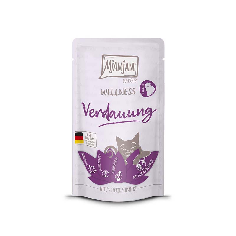 MjAMjAM Wellness Digestión es una comida húmeda natural para gatos elaborada con pollo de alta calidad, cuidadosamente seleccionado para ofrecer una receta suave, equilibrada y fácil de asimilar.