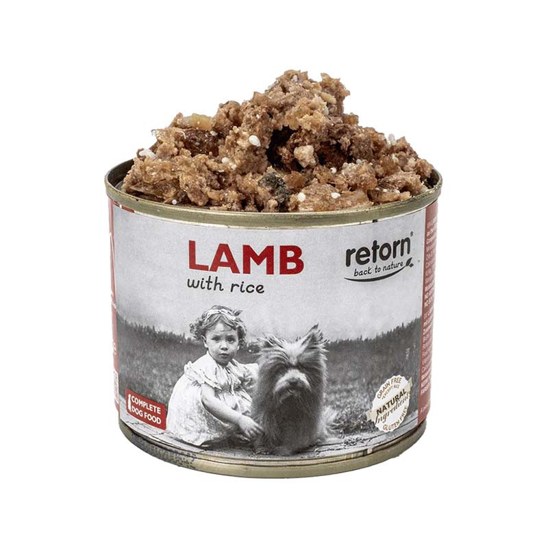 Retorn - Lata Perro Cordero con Arroz es una comida húmeda para perros de alta calidad, diseñado para perros adultos que buscan una dieta equilibrada y fácil de digerir. Esta receta combina la ternura del cordero con la suavidad del arroz, ofreciendo una opción ideal para perros con sensibilidades alimentarias o digestiones delicadas.