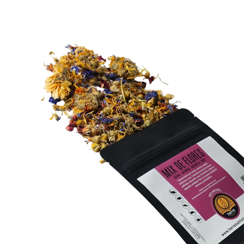 ¡Mima a tu mascota con nuestro Mix de Flores! Un complemento multivitamínico natural de aciano, caléndula, manzanilla y rosa. Ideal para conejos y roedores. Añade un poquito a su comedero a diario.