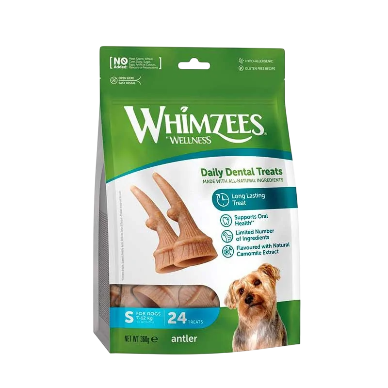 Dale a tu perro la mejor limpieza dental diaria de forma natural. Los Whimzees Antler S son snack para perros masticables sin cereales y de larga duración que combaten el sarro y el mal aliento. ¡Higiene oral fácil para perros pequeños!